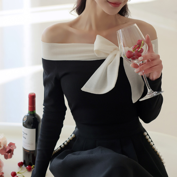 薄纱 配色 蝴蝶结 Open 肩膀 T恤衫