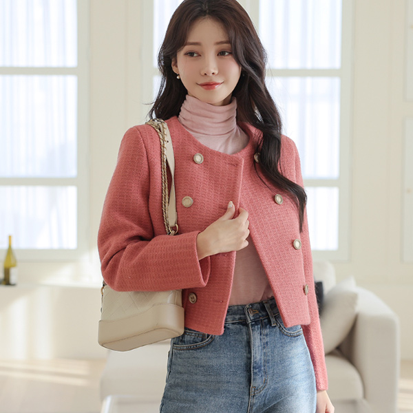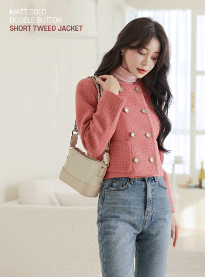 哑光 黄金 双 扣子 短 粗呢 夹克