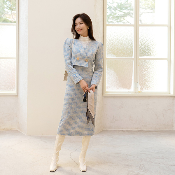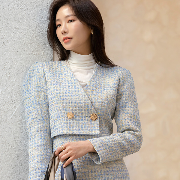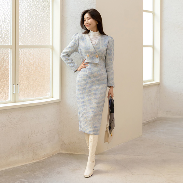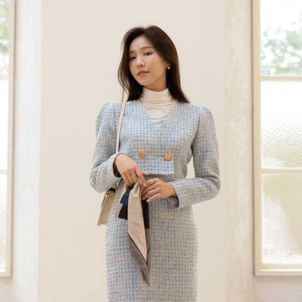 奢华裙 黄金 扣子 两件套 风格 粗呢 羊毛 连衣裙