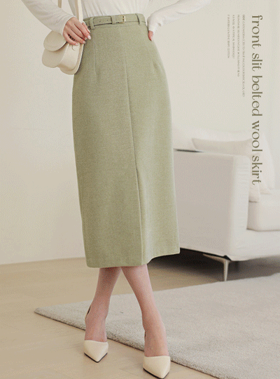 前面 开衩 束带 羊毛 裙子