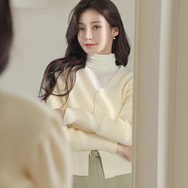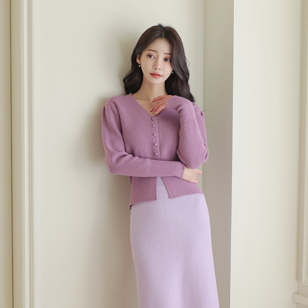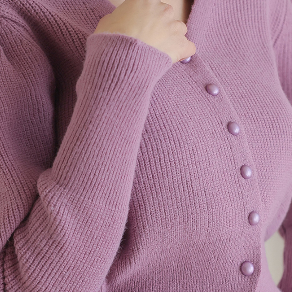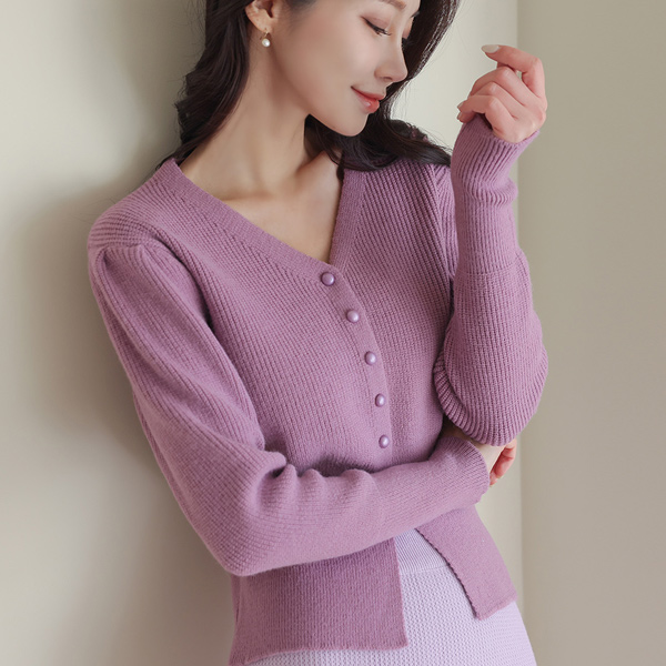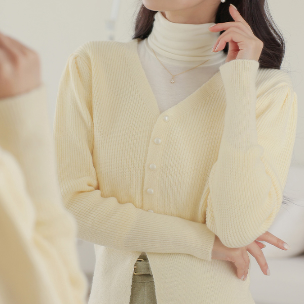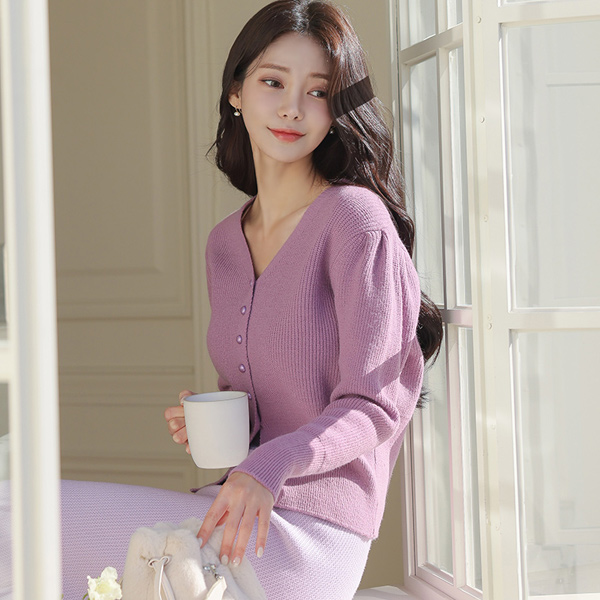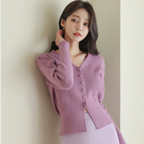 V字领 宽松 罗纹布 泡泡袖 开衫