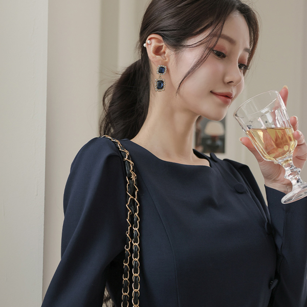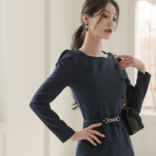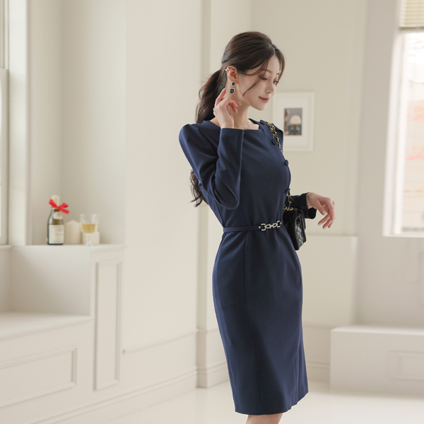 侧纽 扣子 束带 弹力 连衣裙