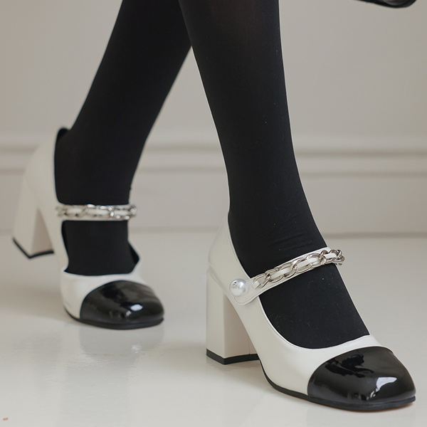 链条 皮条/束带 双色 配色 玛莉·珍 浅口式高跟鞋