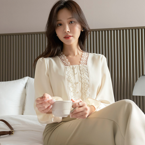 苗条 情调 蕾丝 配色 松紧带 袖 罩衫