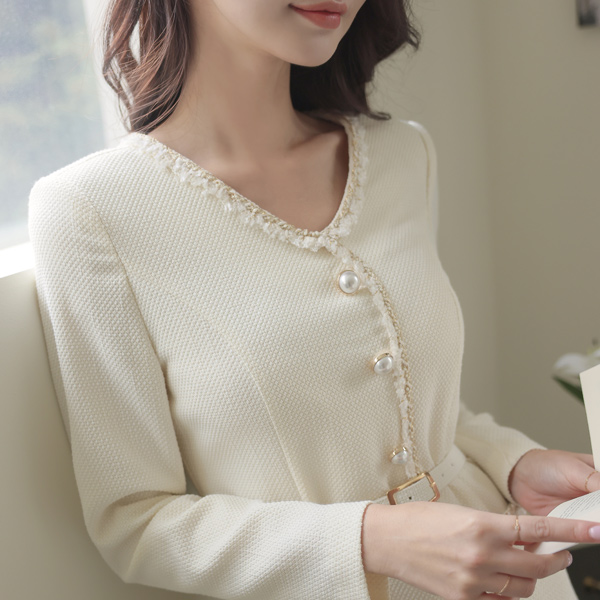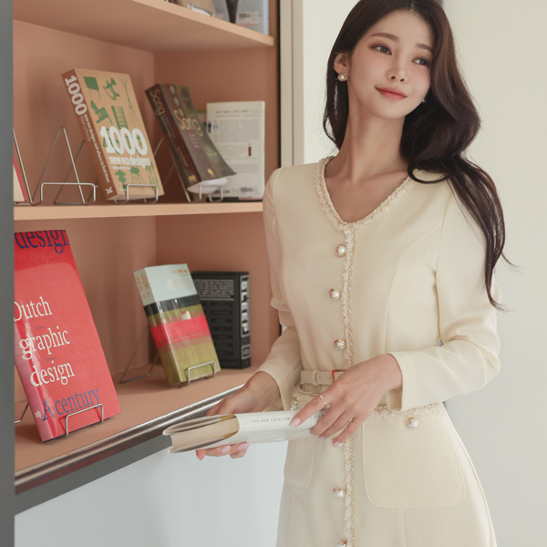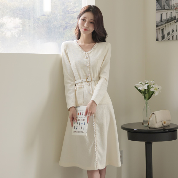 V字领 珍珠 扣子 粗呢 A字型 连衣裙