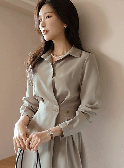 花园 翻领 后侧松紧带 A字型 连衣裙