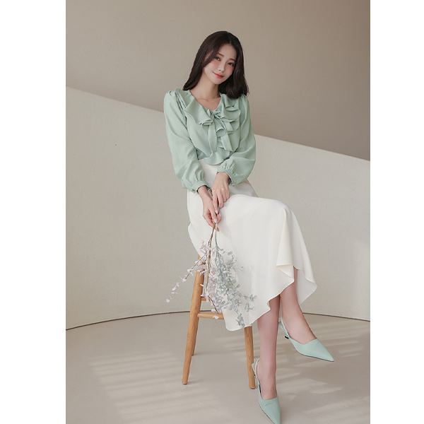 二重 荷叶 领子 松紧带 袖 透视 罩衫