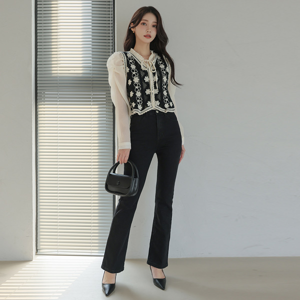花纹 编织 马甲&透视 蝴蝶结 罩衫 SET