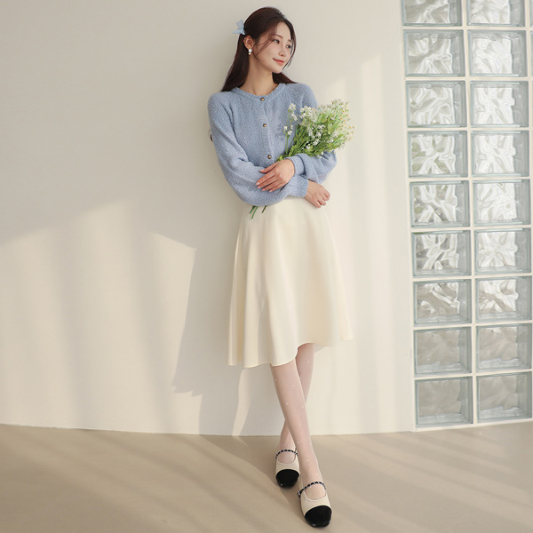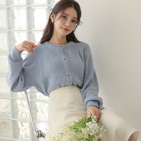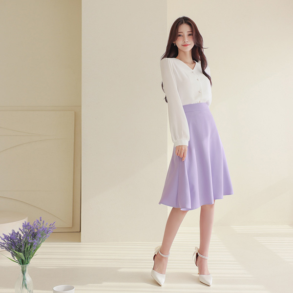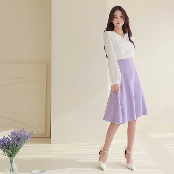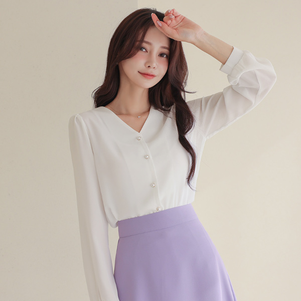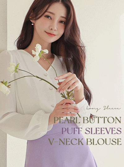 珍珠 扣子 泡泡袖 袖 V字领 罩衫(长袖)