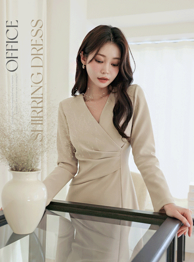 V字领 细褶 褶皱 喇叭 连衣裙