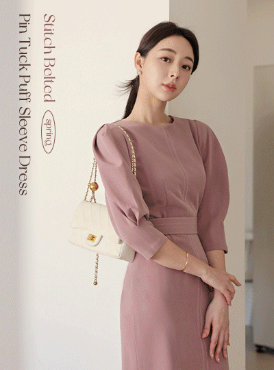 缝线 束带 细褶 泡泡袖 袖子 连衣裙(spring)