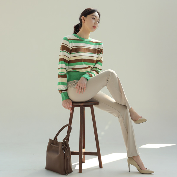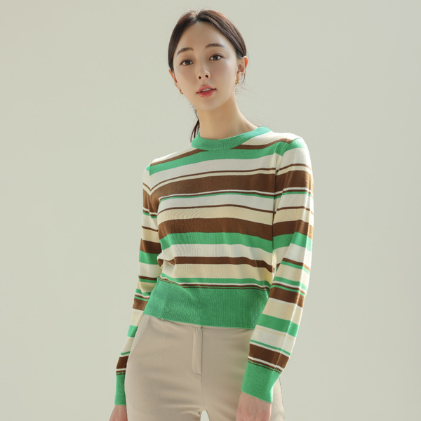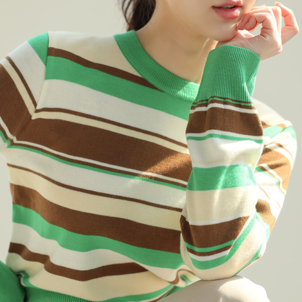 柔丝 颜色 条纹 圆领 针织衫