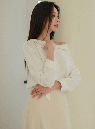 单 肩膀 敞开式 蝴蝶结 领带 9分 袖 罩衫