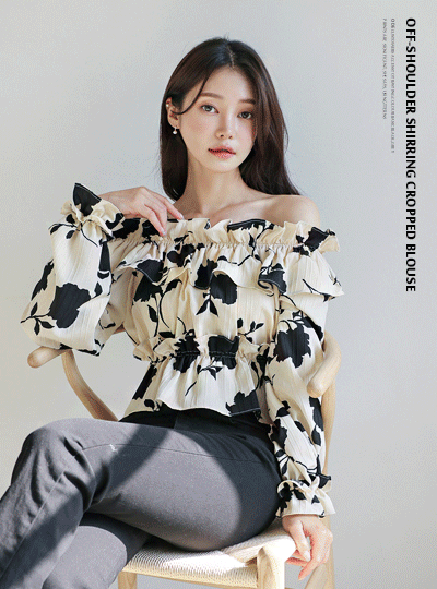 Black 花纹 露肩 褶皱 7分裤 罩衫