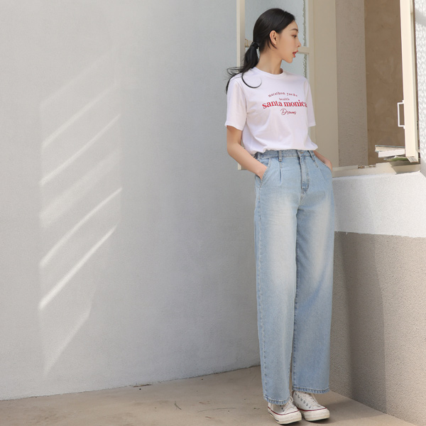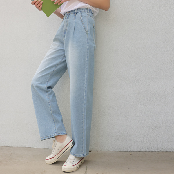 细褶 后腰松紧带 宽松 牛仔色 裤子