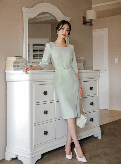 方领 郁金香 斜线 开衩 弹力 连衣裙