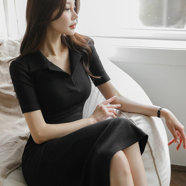 领子 修身条绒 开衩 连衣裙