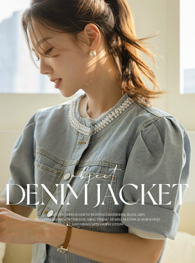 天然 珍珠 点缀 泡泡袖 牛仔色 夹克