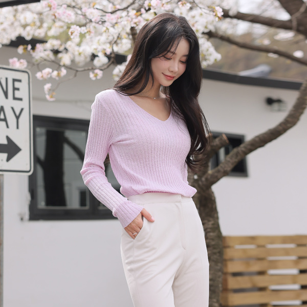 White 结子花式 V领 条绒 针织t恤