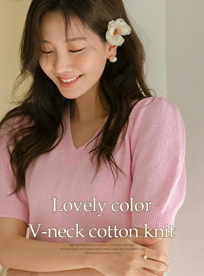 可爱 颜色 泡泡袖 V字领 棉 针织衫