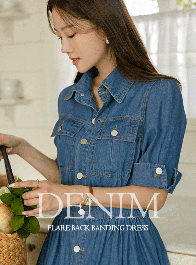 轻微的 牛仔色 喇叭 后侧松紧带 连衣裙