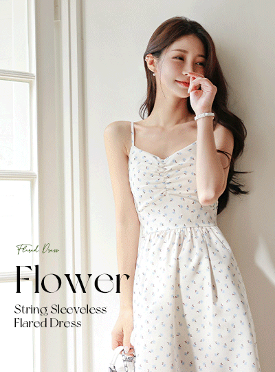 迷你 花纹 前面 褶皱 吊带背心 喇叭 连衣裙