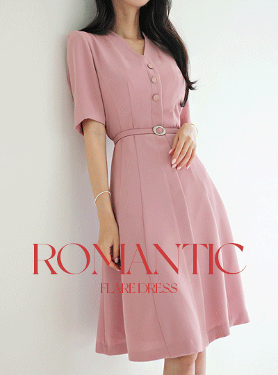 V字领 三 扣子 束带 喇叭 连衣裙