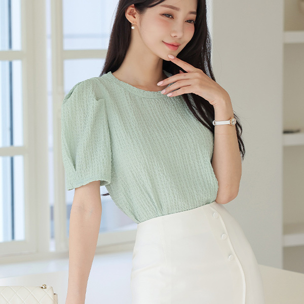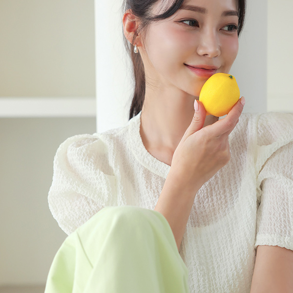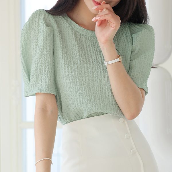 去皱纹 细褶 泡泡袖 袖 7分裤 罩衫