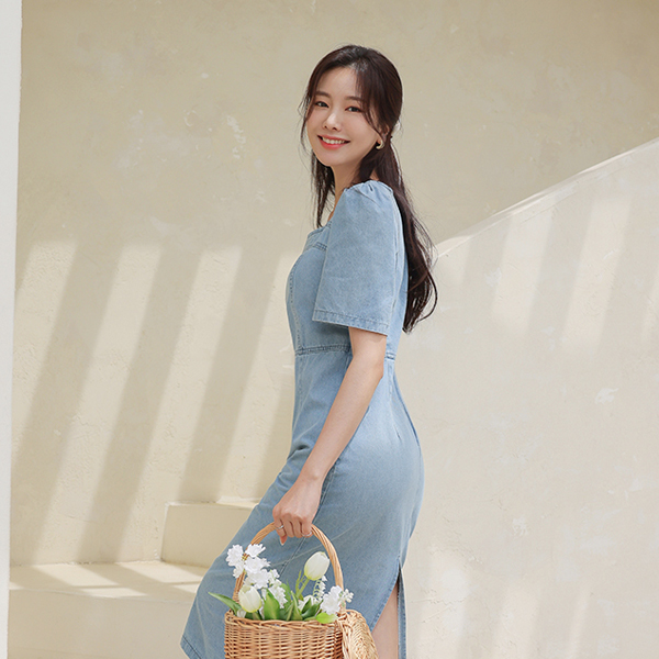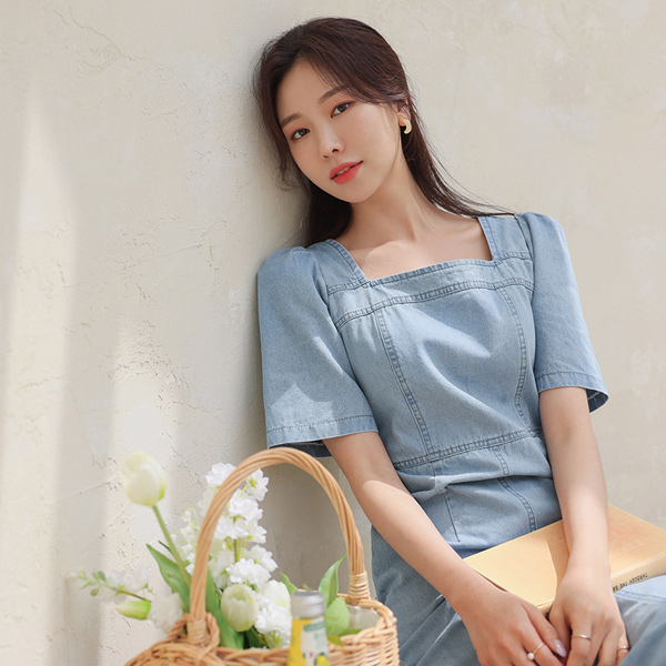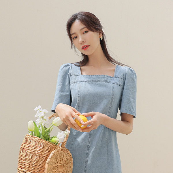 简单 H字型 方领 牛仔色 连衣裙