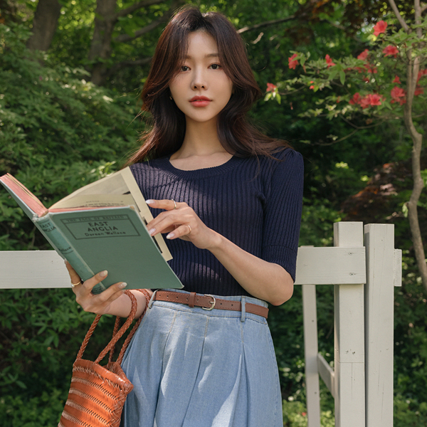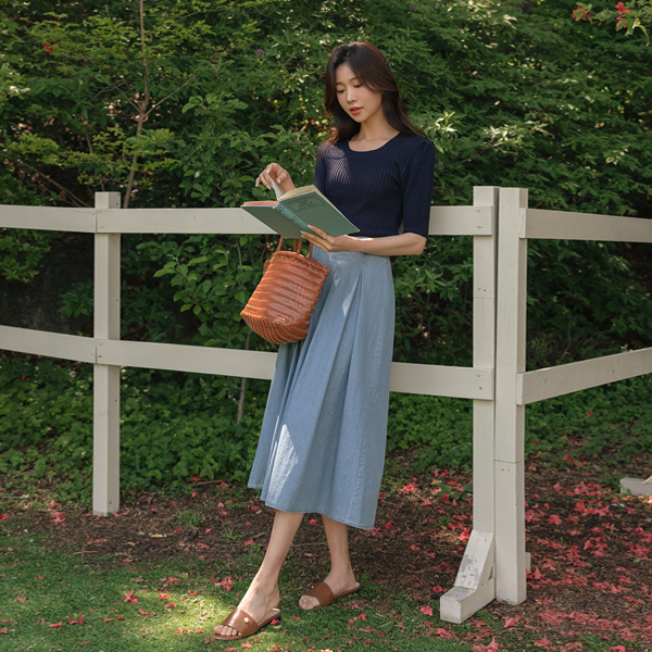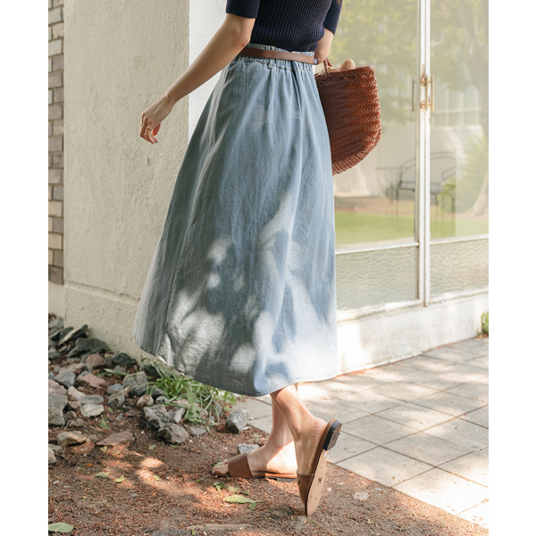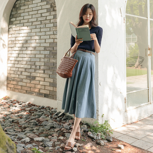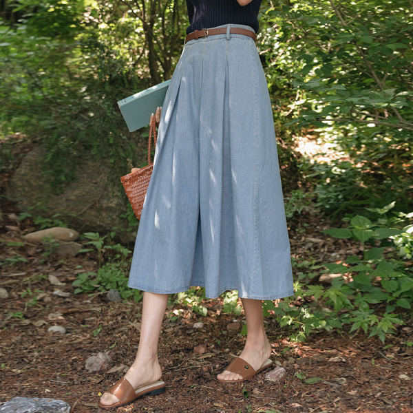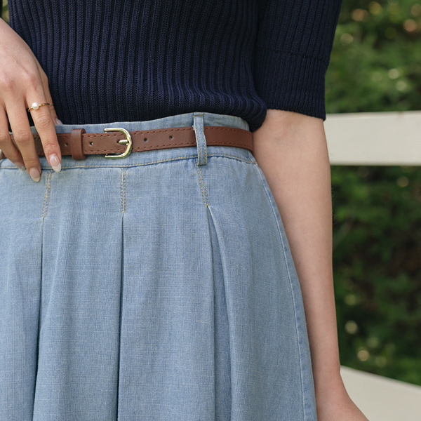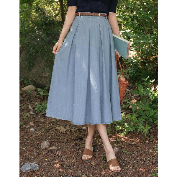 茑萝 褶皱 牛仔色 A字型 裙子 (腰带SET)