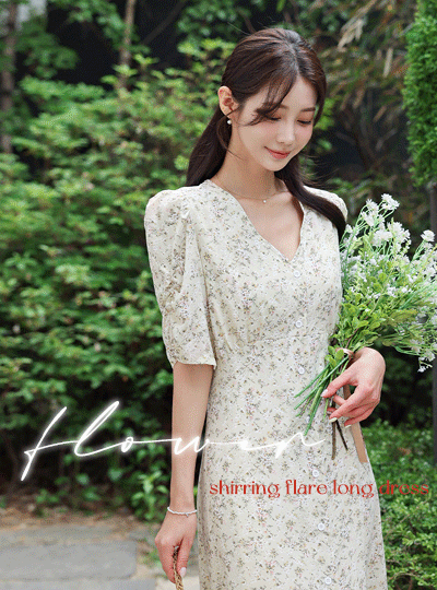 碎花 V字领 袖 褶皱 喇叭 长款 连衣裙