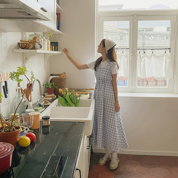 郊游装 格子 图案 夏天 抽绳 连衣裙