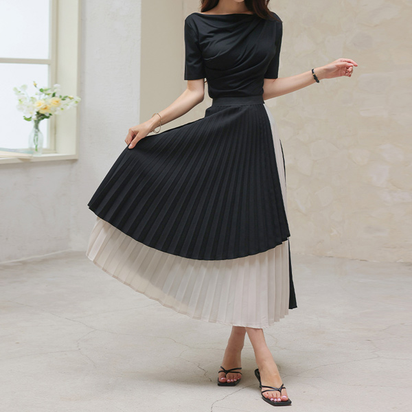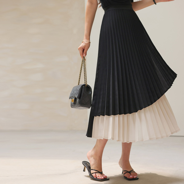 亚麻 不规则 裁剪 配色 褶边 松紧带 长款 裙子