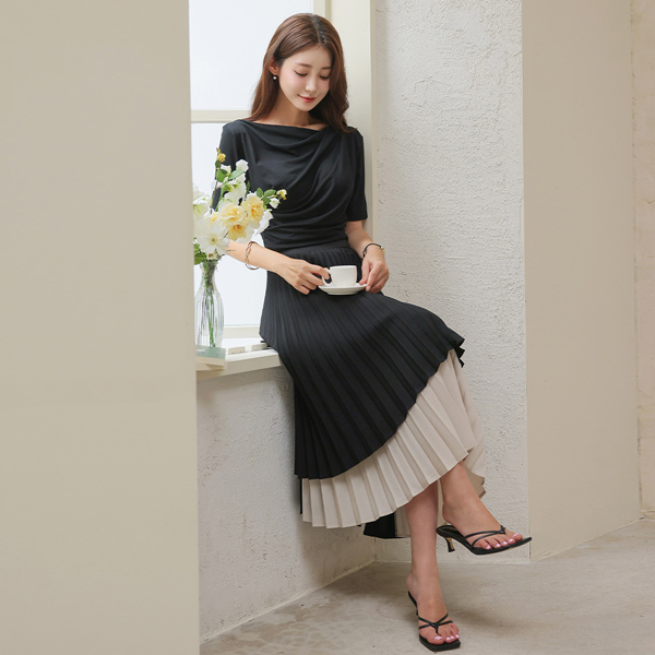 柔色 颜色 船形领 褶皱 弹力 T恤衫