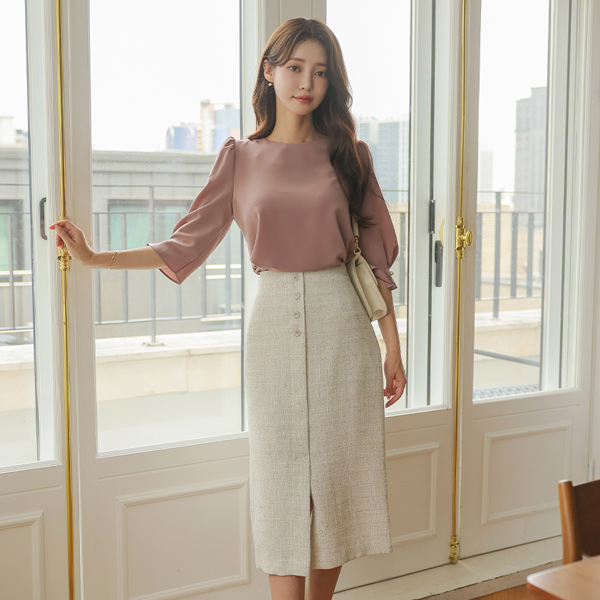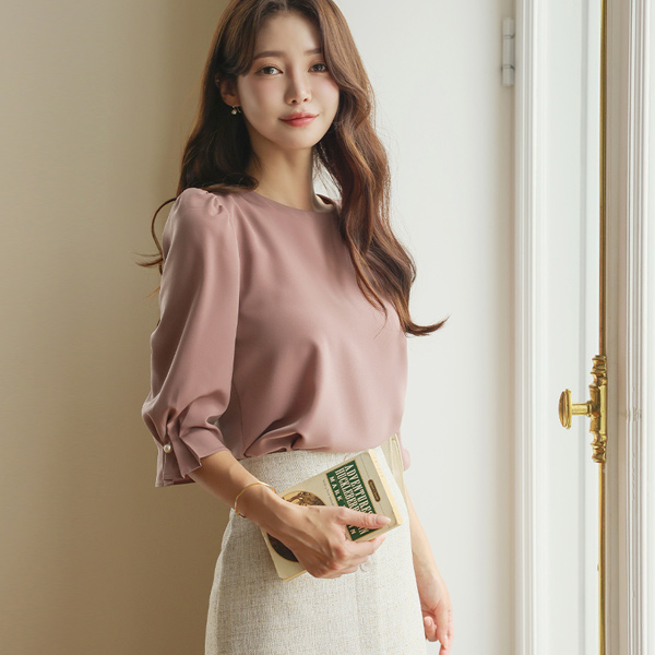 圆领 7分袖 细褶 珍珠 点缀 罩衫