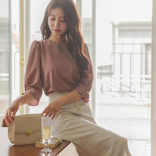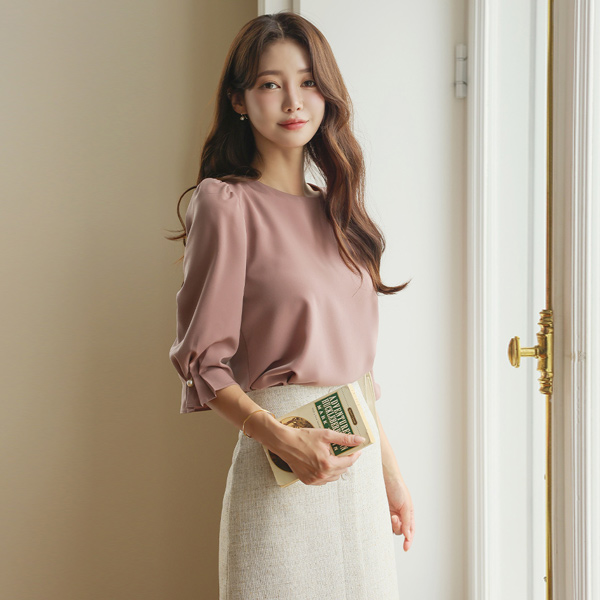 圆领 7分袖 细褶 珍珠 点缀 罩衫