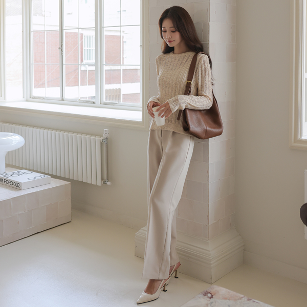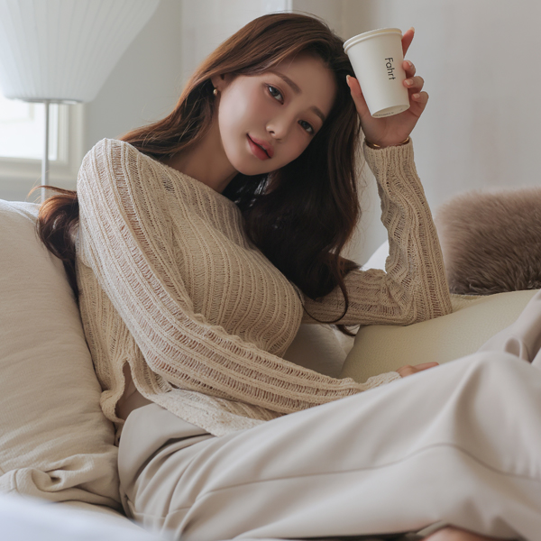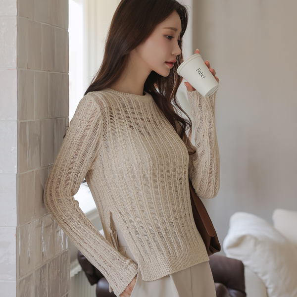 日常 侧纽 开衩 透视 网 针织衫