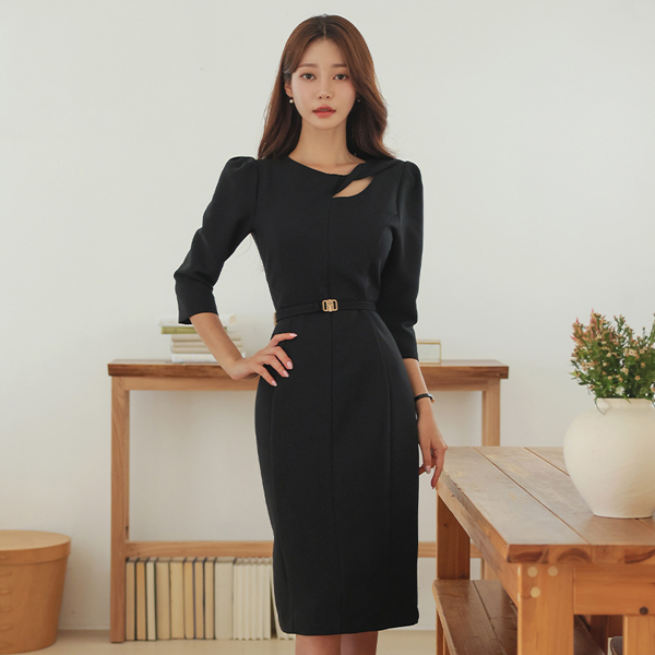 사이드넥 扭曲 点缀 束带 H字型 连衣裙