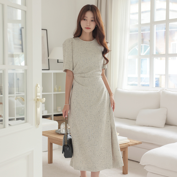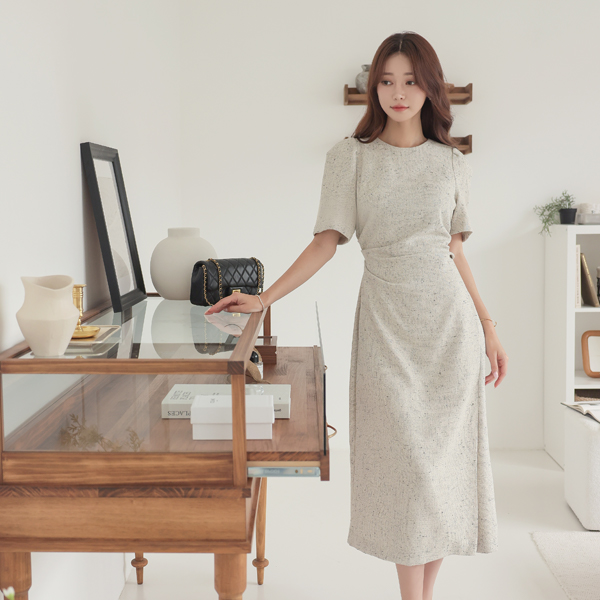 渲染 侧纽 褶皱 泡泡袖 袖 开衩 长款 连衣裙