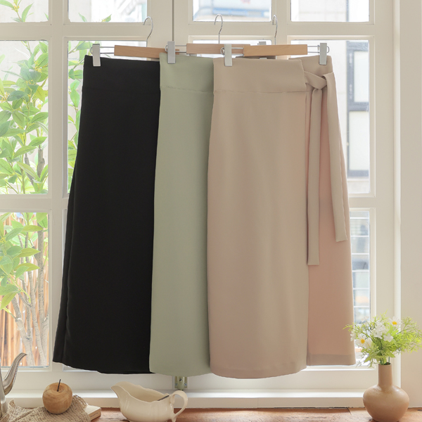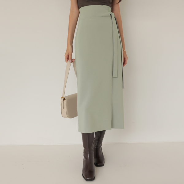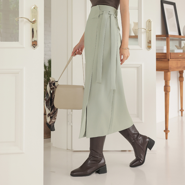 侧纽 皮条/束带 点缀 后腰松紧带 开叉 长款 裙子