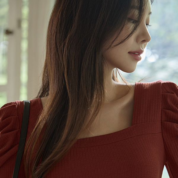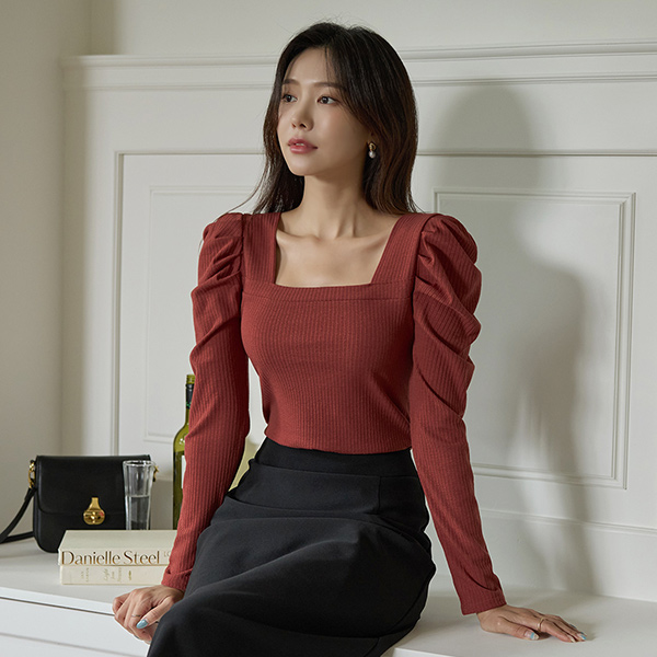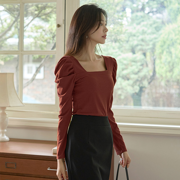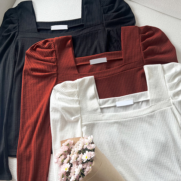 优雅 泡泡袖 袖 方领 条绒 T恤衫