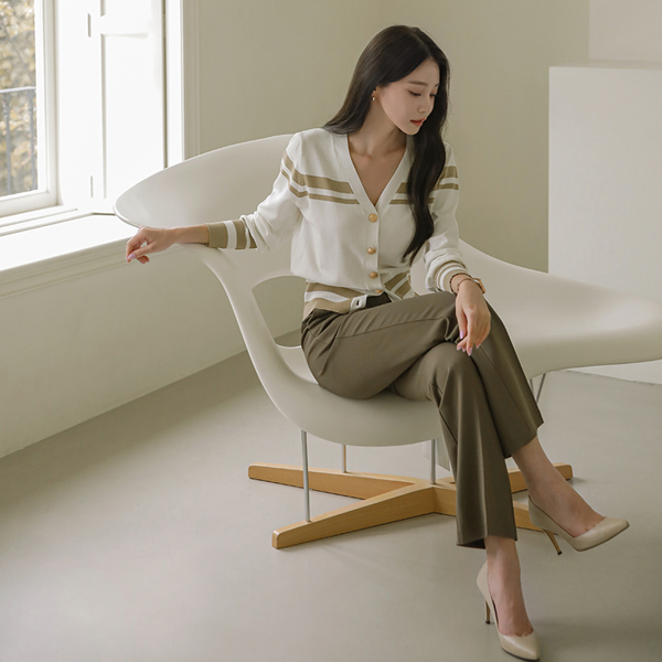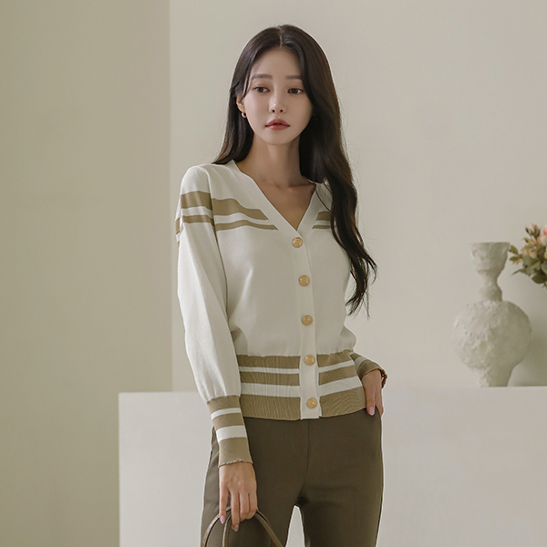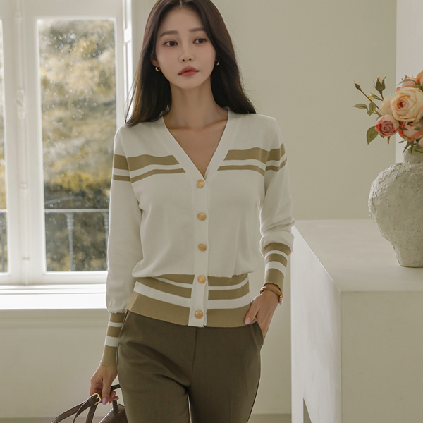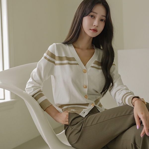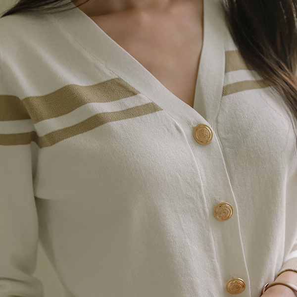 条纹 配色 点缀 黄金 扣子 开衫