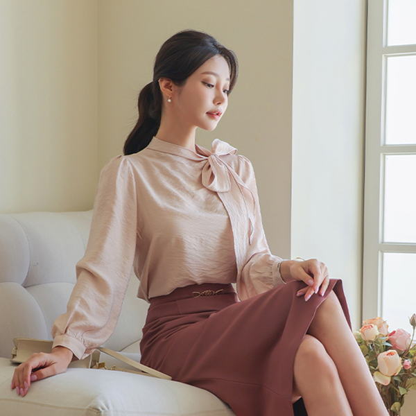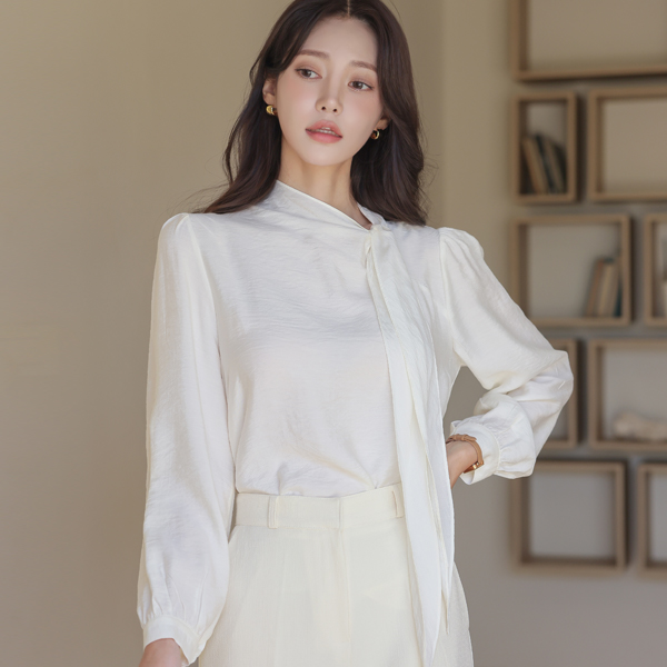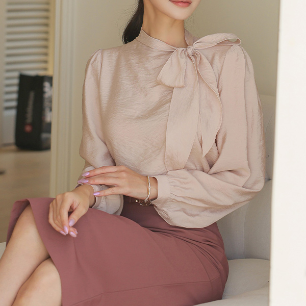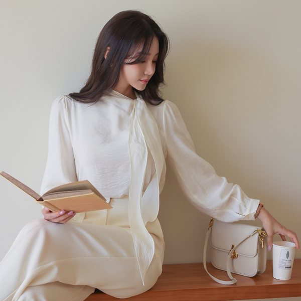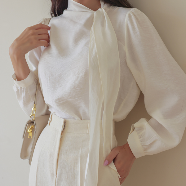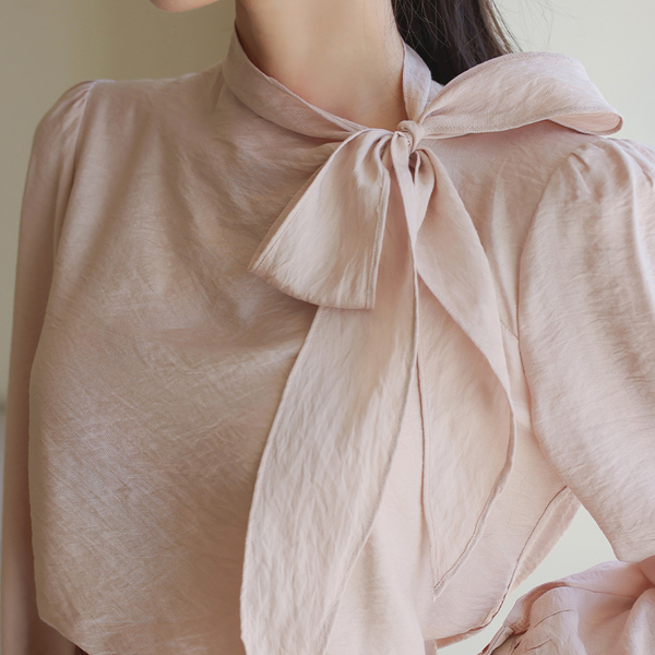 半高领 侧纽 蝴蝶结 领带 罩衫