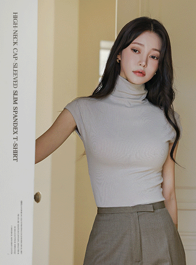 高龄 帽檐袖 条绒 斯利姆 弹力 T恤衫