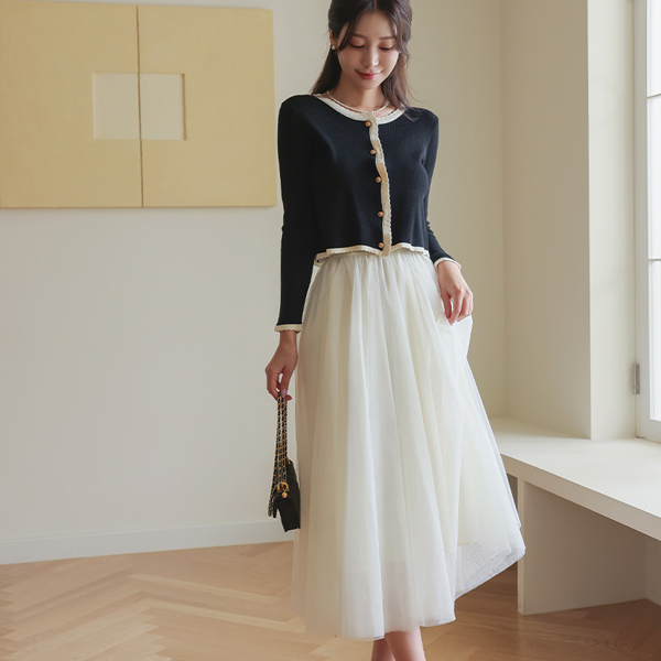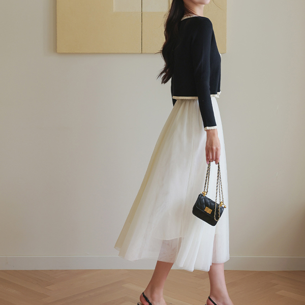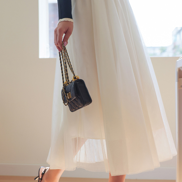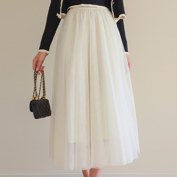 可爱 二重 薄纱 松紧带 喇叭 长款 裙子