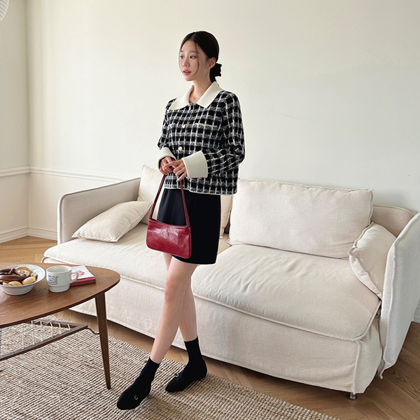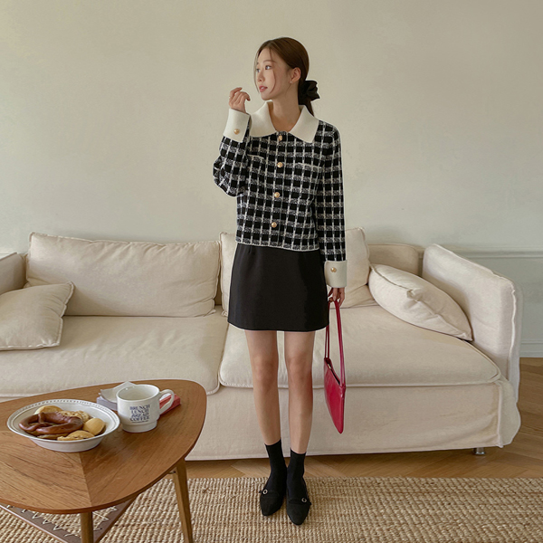 黄金 扣子 翻领 格子 针织衫 开衫