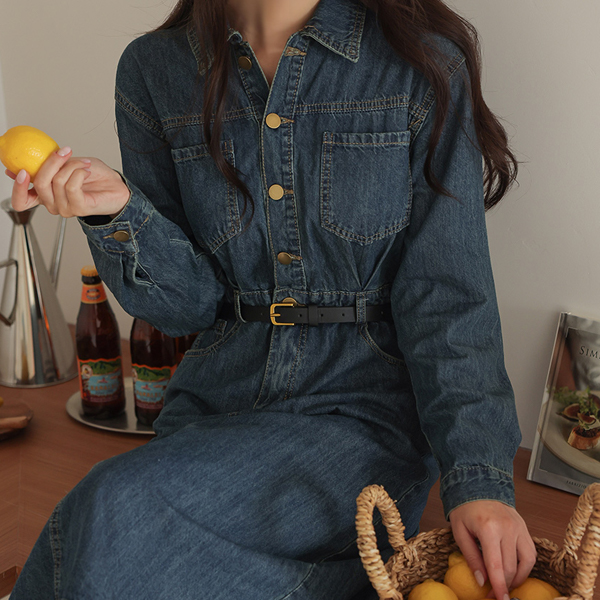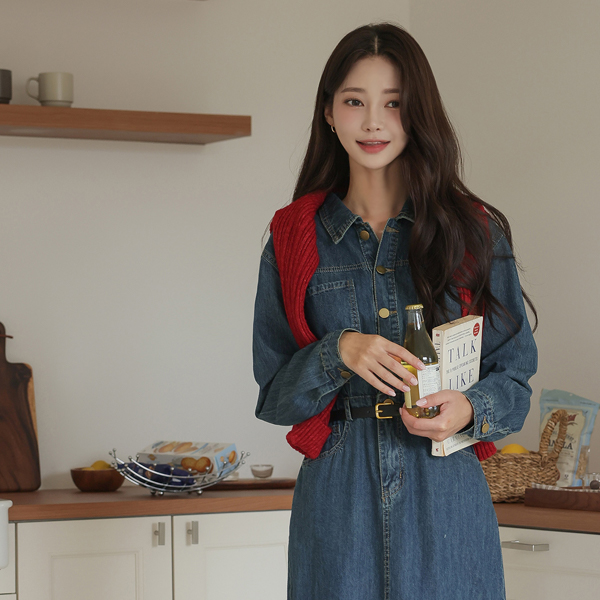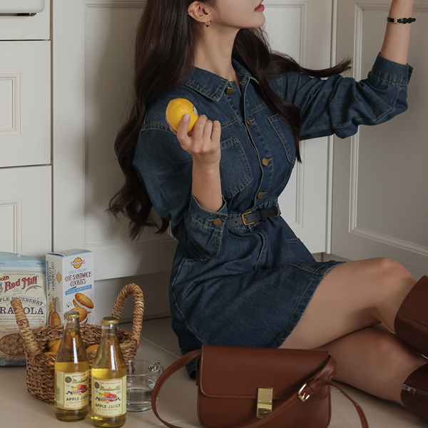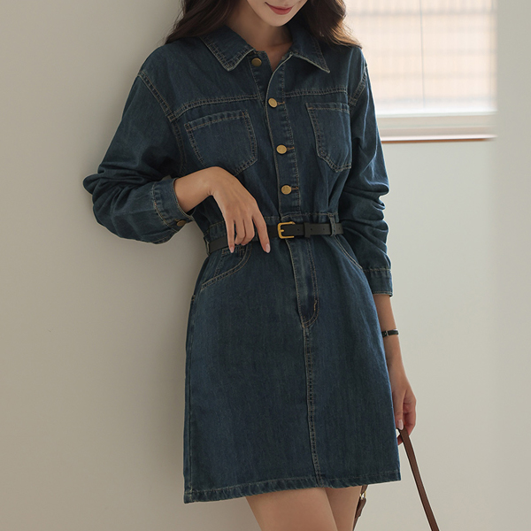 衬衫 领子 束带 牛仔色 连衣裙 (2type)