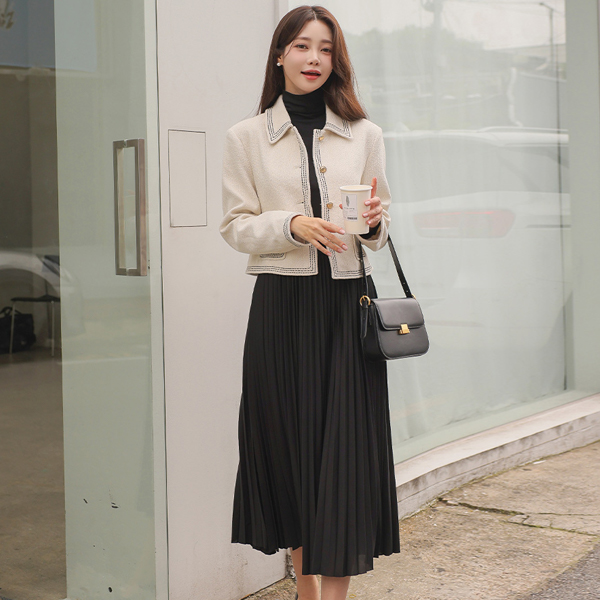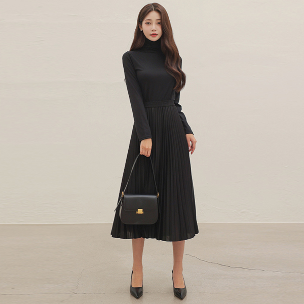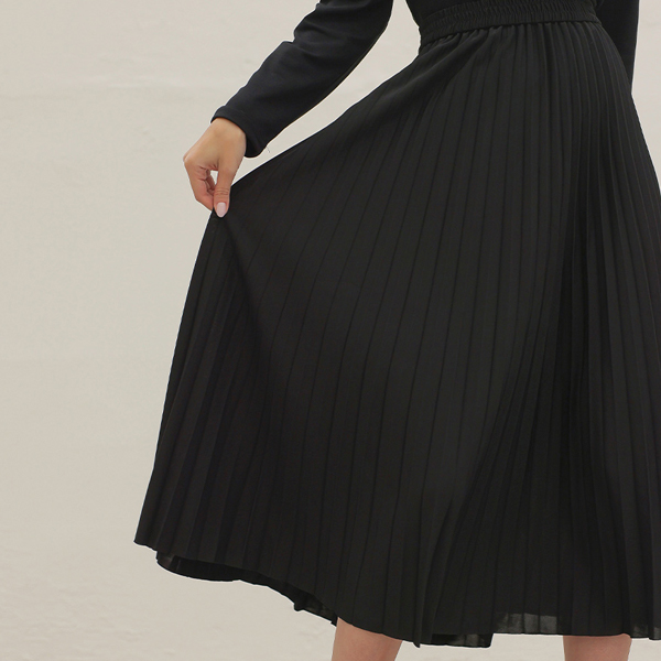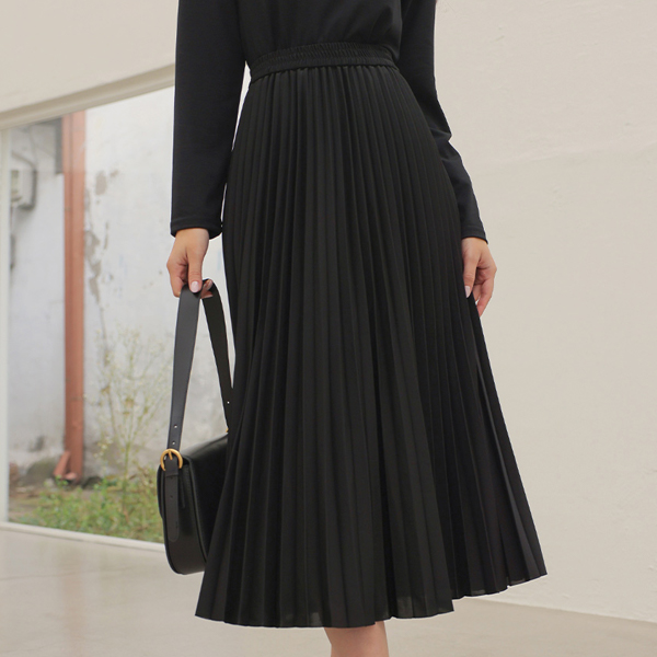 细密 腰 松紧带 잔 褶边 长款 裙子