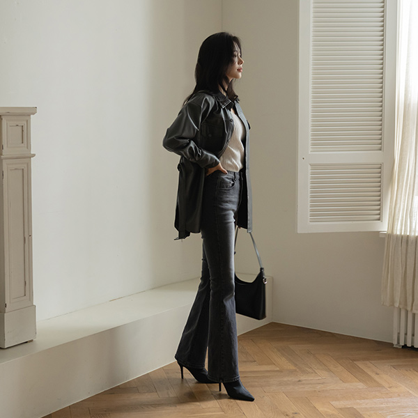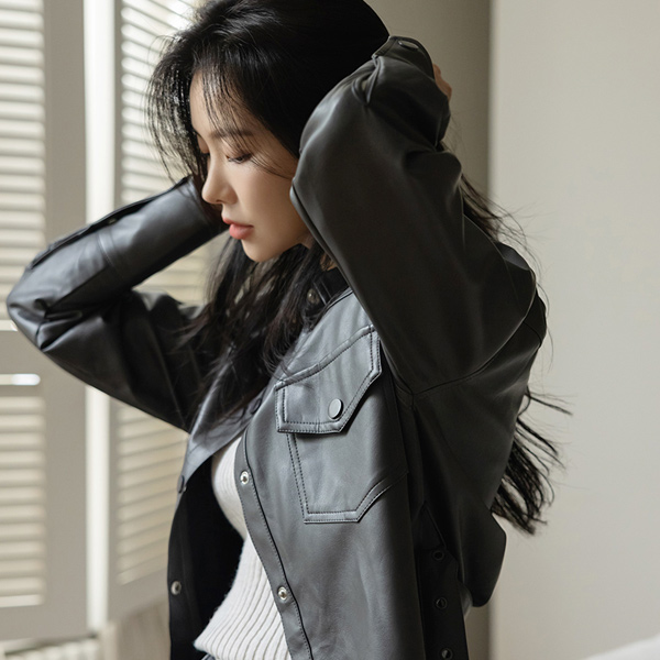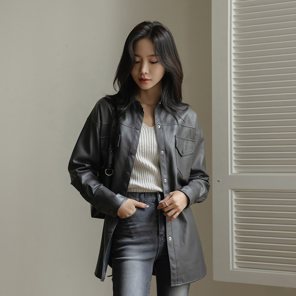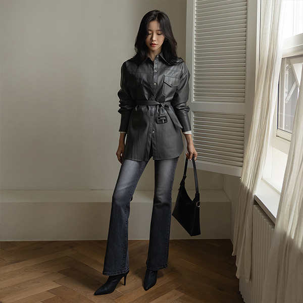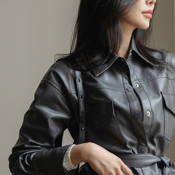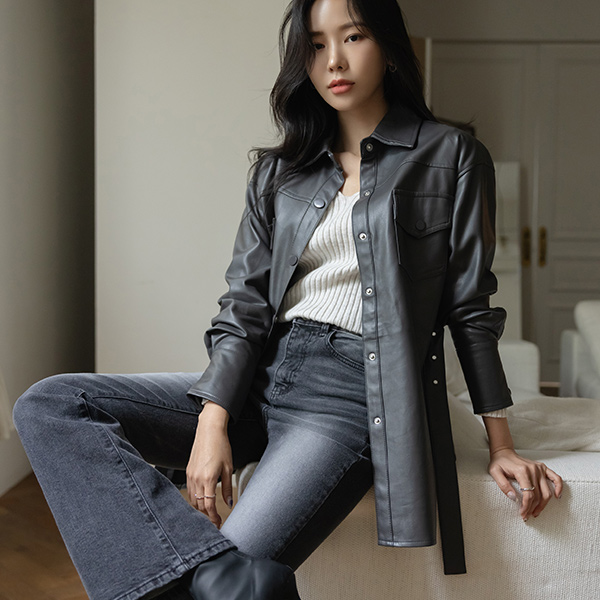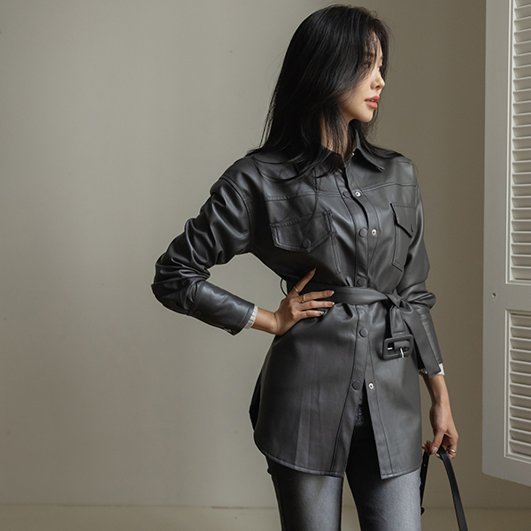 Eco 人造皮夹 宽松 衬衫 夹克 (腰带SET)