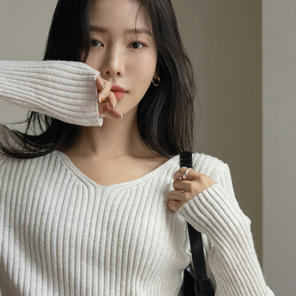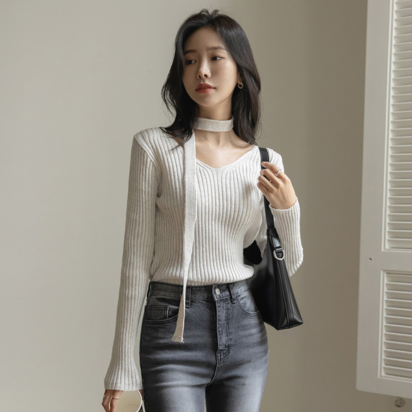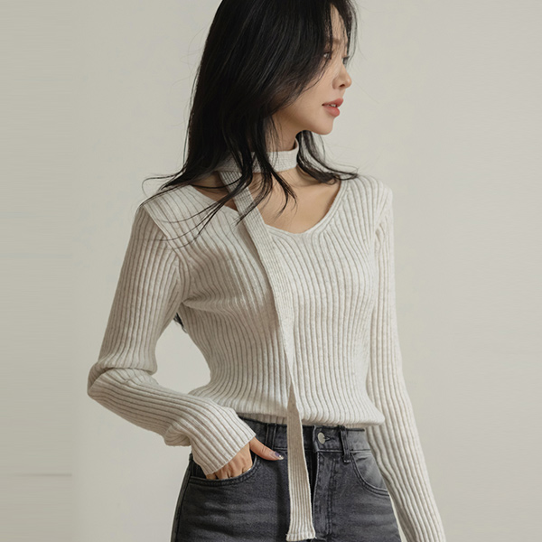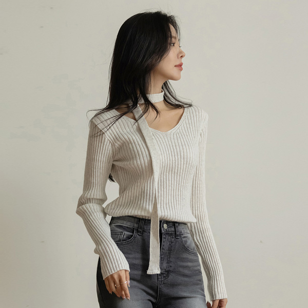 V字领 斯利姆 条绒 围巾 (套装) 针织衫